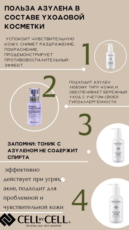 Азуленовая линия Cell by Cell - Это четыре космецевтических продукта для заботы о хрупкой, капризной, тонкой и гиперчувствительной кожи с выраженными сосудиками, а также для кожи с высыпаниями и аллергией. Эти бьюти баночки отлично подходят для ухода после пилингов, инъекций, шлифовок и аппаратных процедур.